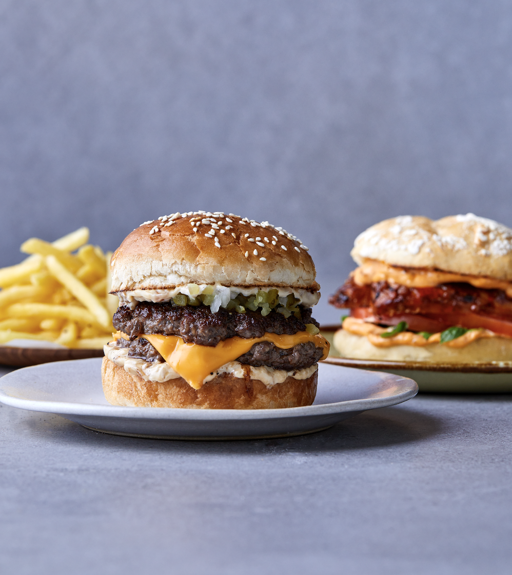 A juicy grilled beef patty topped with melted cheddar, fresh lettuce, tomato, pickles, and Bravo’s special sauce on a toasted sesame bun.