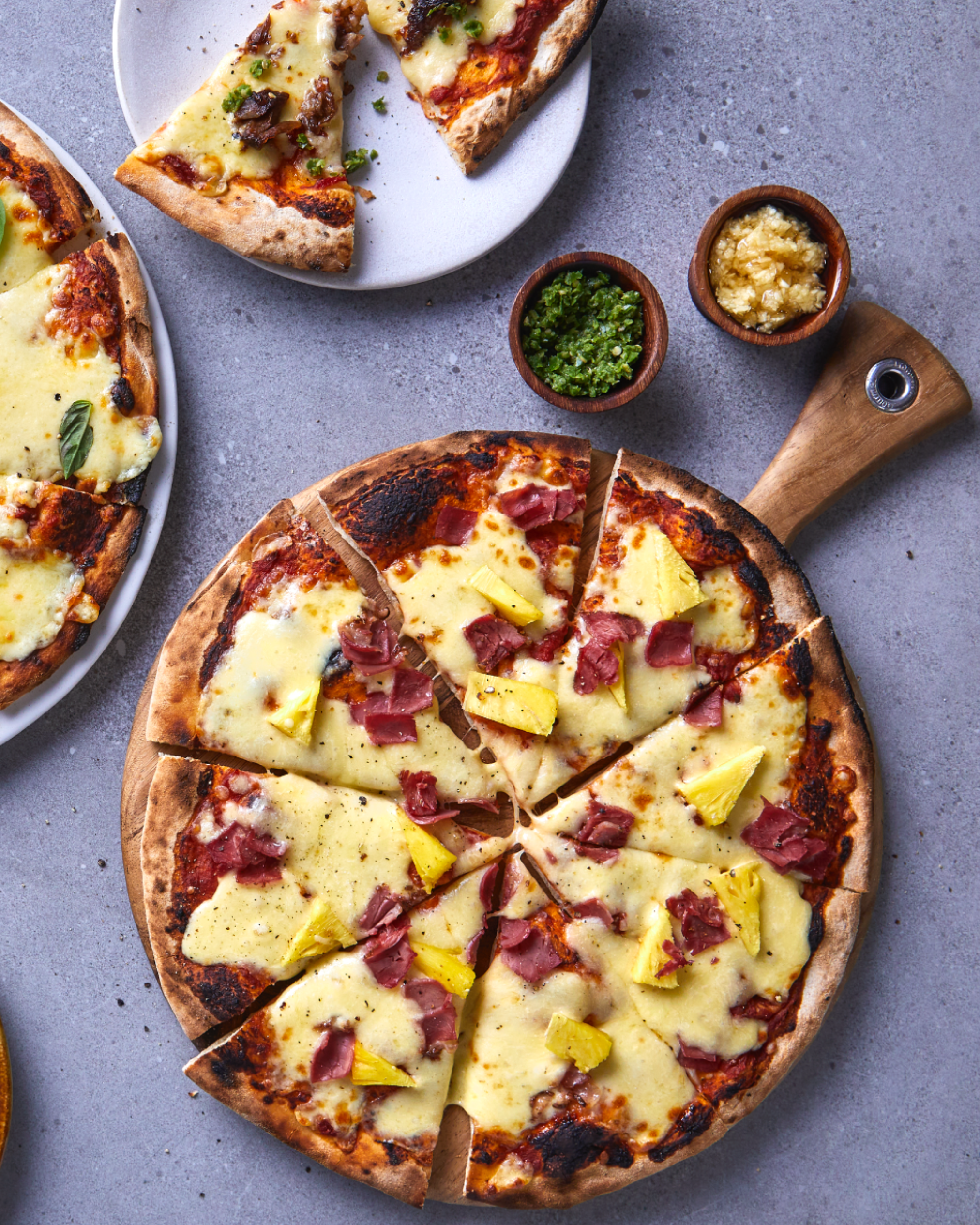 A tropical favorite with sliced ham, pineapple chunks, mozzarella, and tomato base.